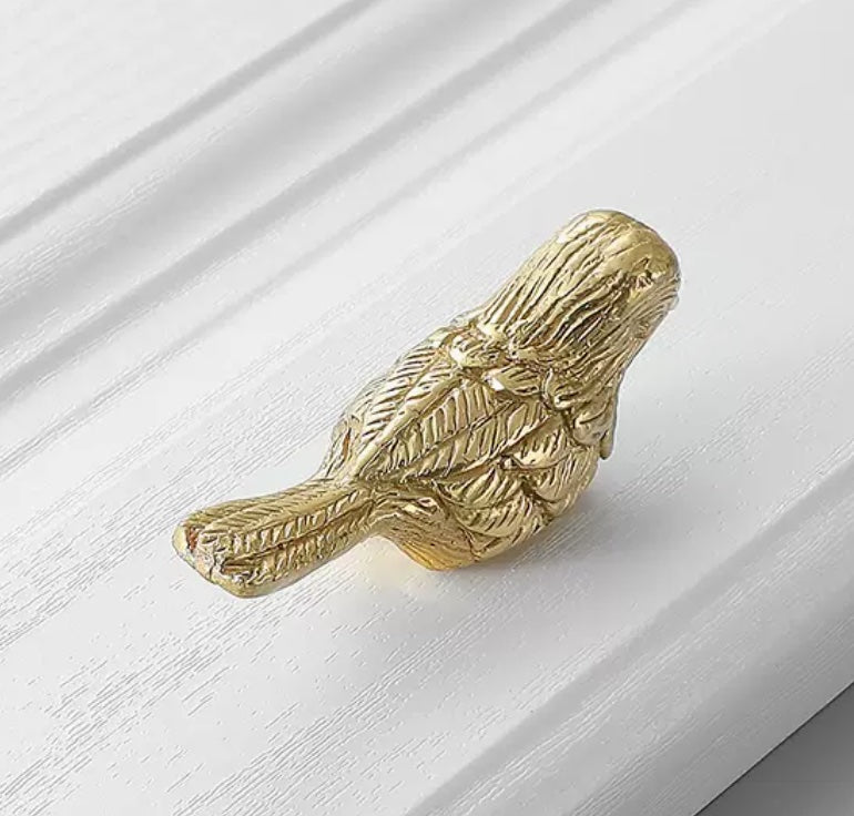 Cabinet knob, bird shape, light gold colour, mat finish. Brings a sharp and modern look to your furnitures for a stylish home. - ReStock info below -