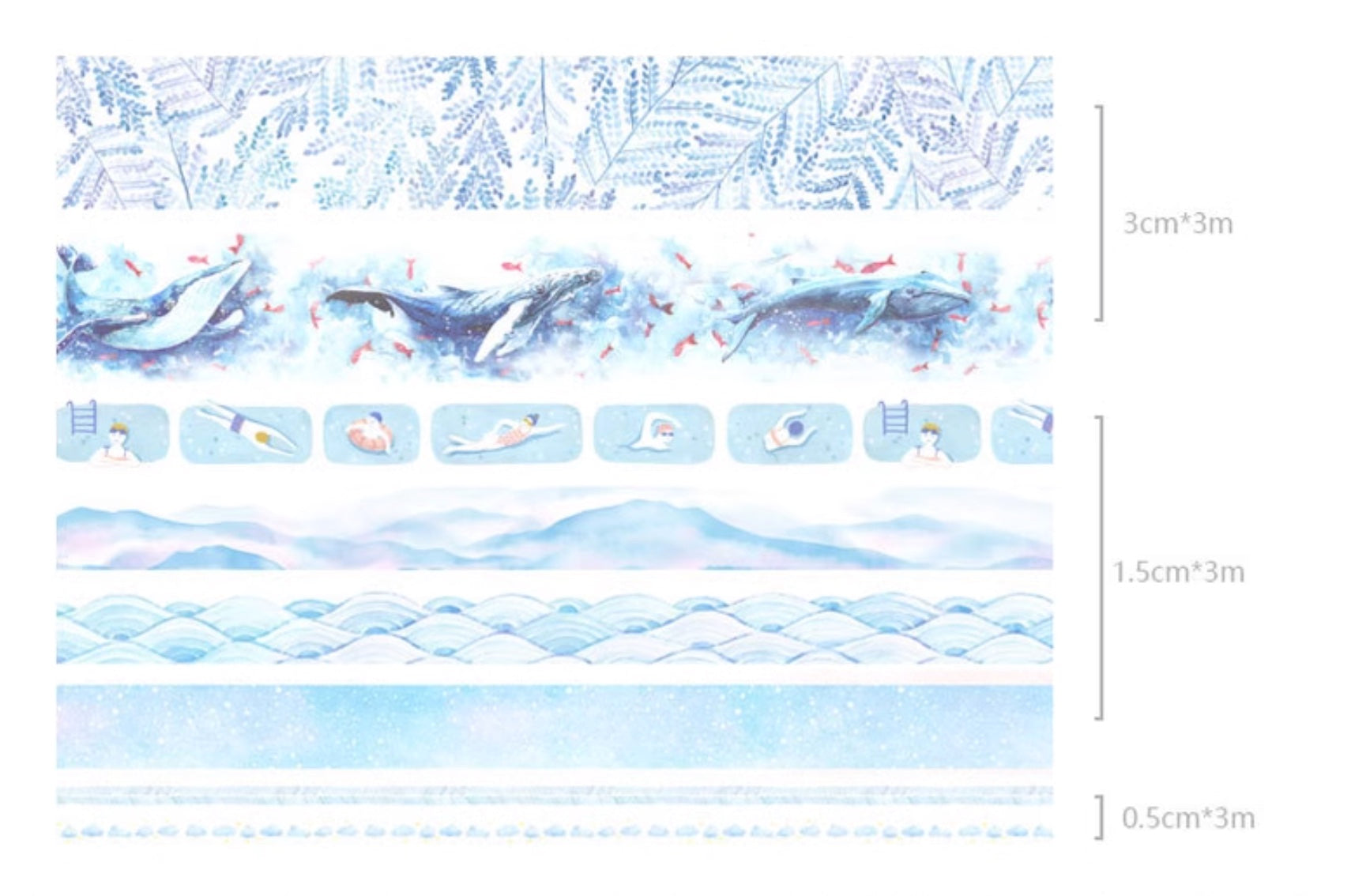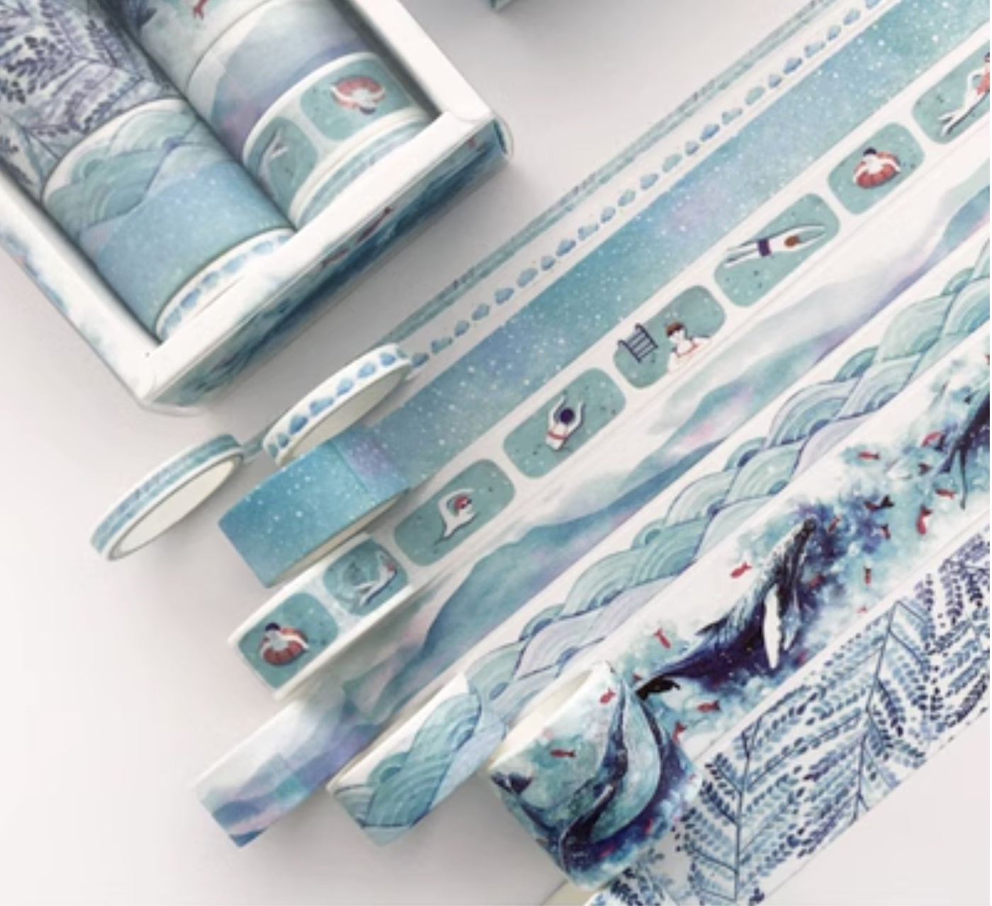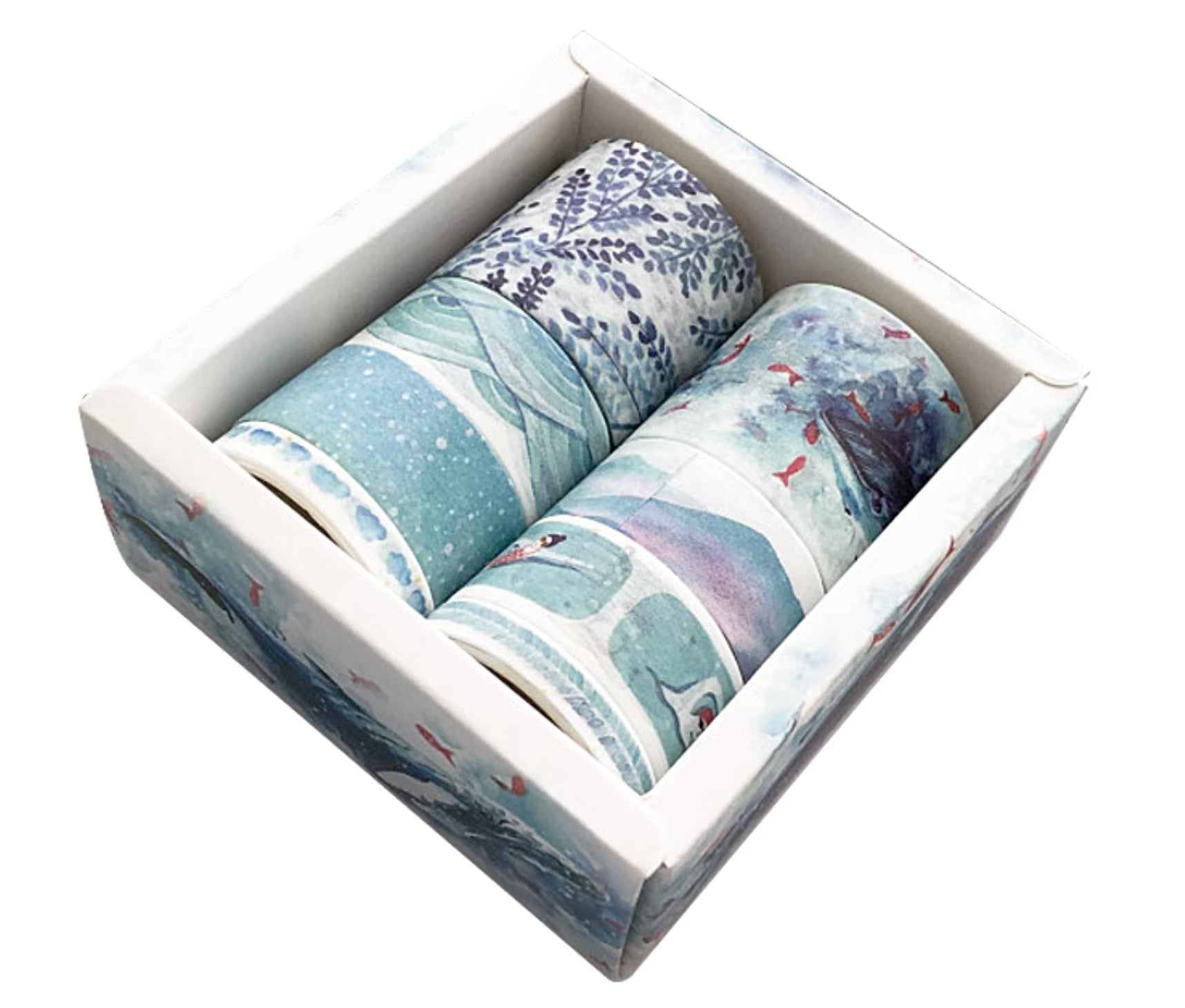 Decorative paper tape for crafts, watercolour style, set of blue shades. Very light and smooth "masking tape" type for crafts decoration. Can be placed and removed easily. Set of different sizes and patterns, packaged in a matching paper box. - ReStock info below -