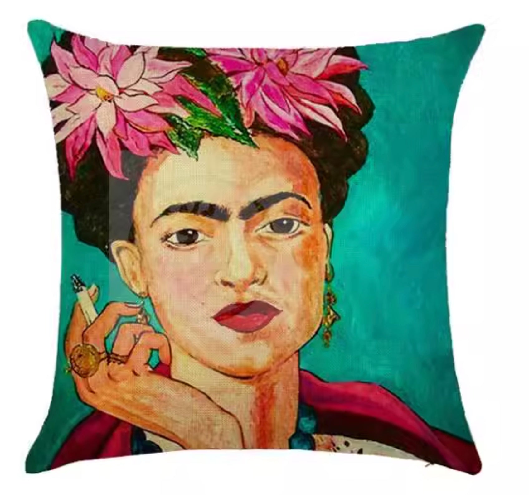 Multicoloured Frida Kahlo printed linen Cushion cover. Brings a Boho pop of colour to your Sofa or chairs. Easily removable and washable (hand-wash advised). - ReStock info below -