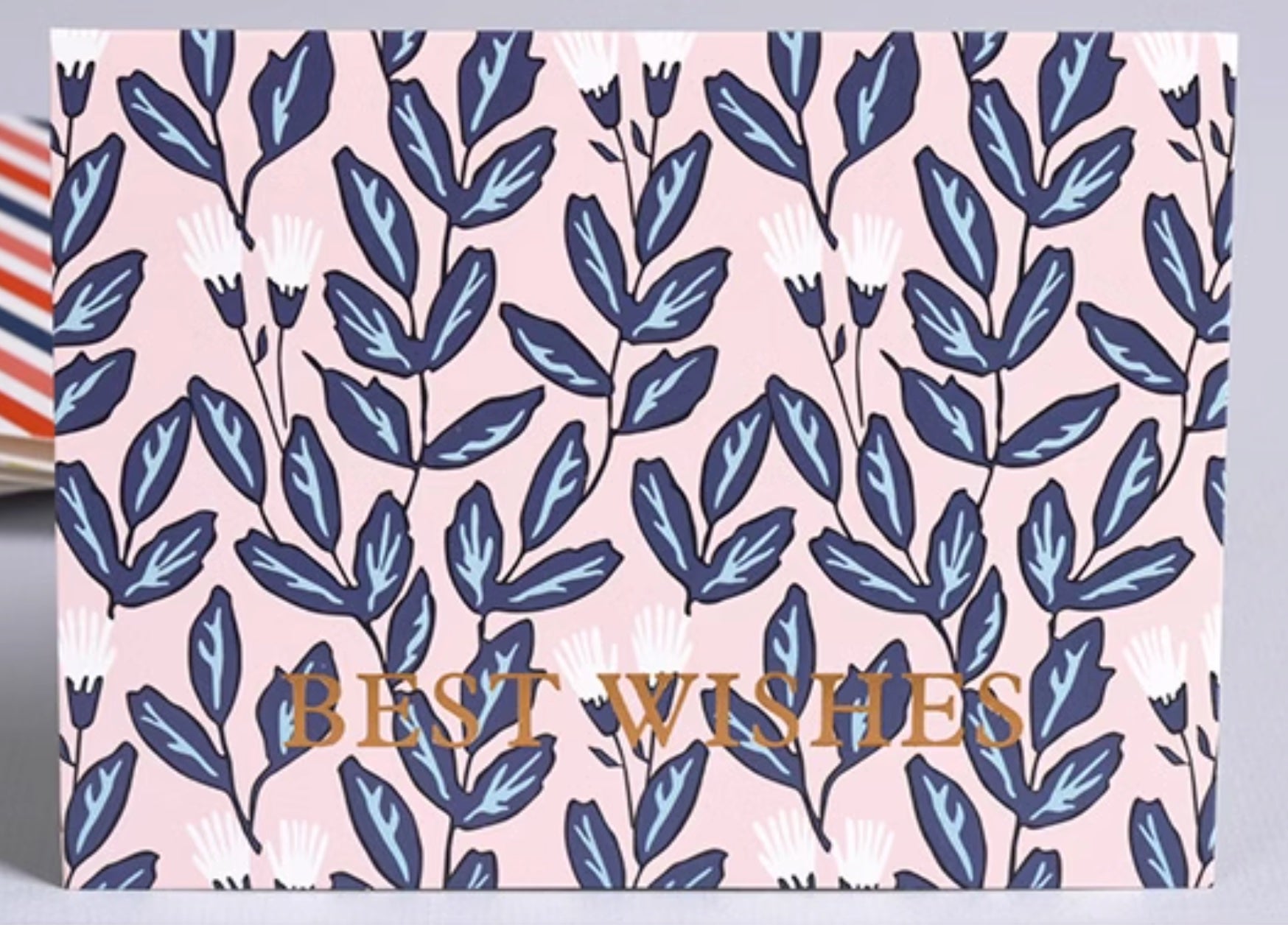 Golden embossed Wishes Card with kraft envelop, pink and blue with flowers. Bring an extra touch to your messages with this stylish and original card. Its thick and smooth paper is perfect for quality writing and its golden embossed letters gives that special spark that sets it apart. - ReStock info below -