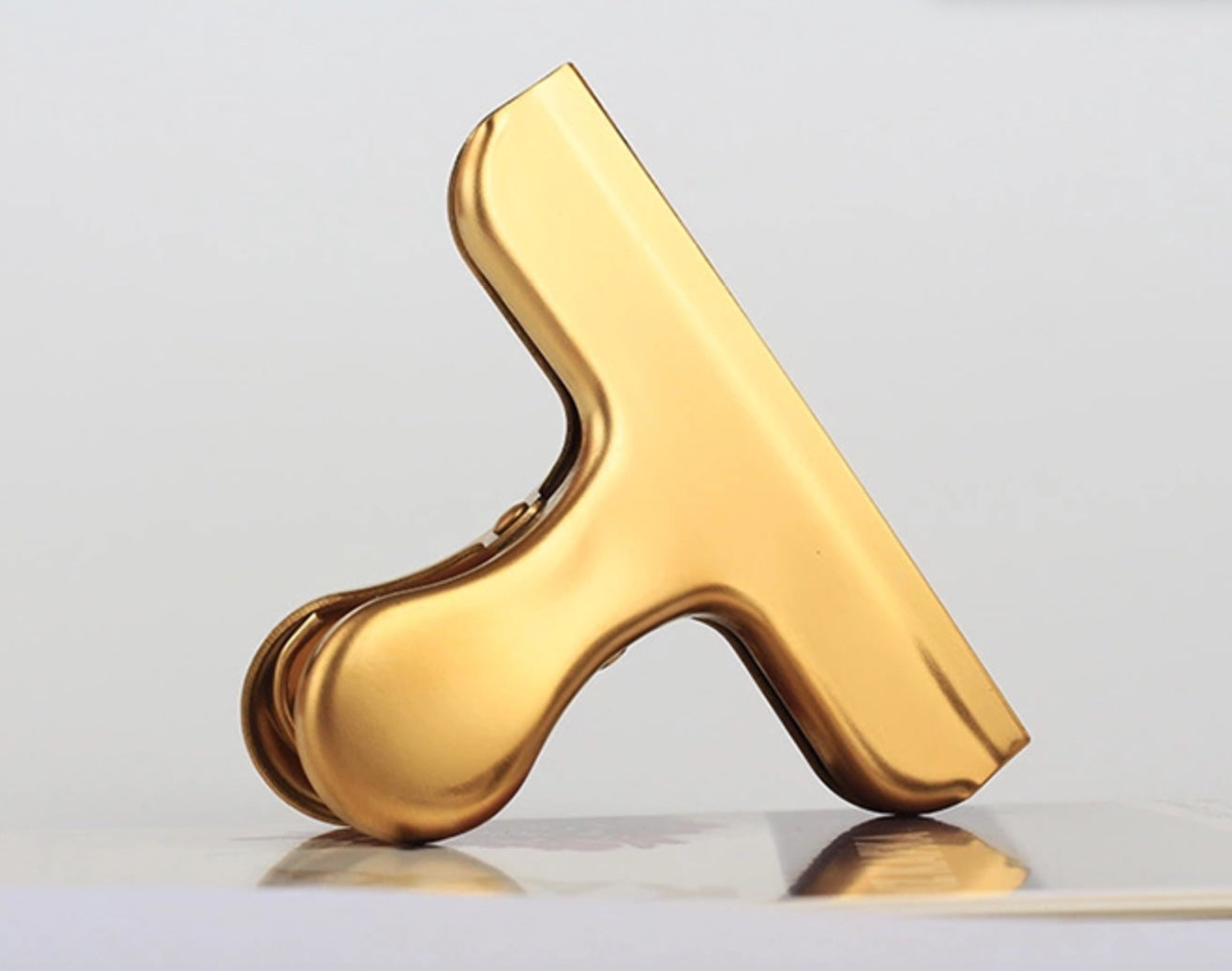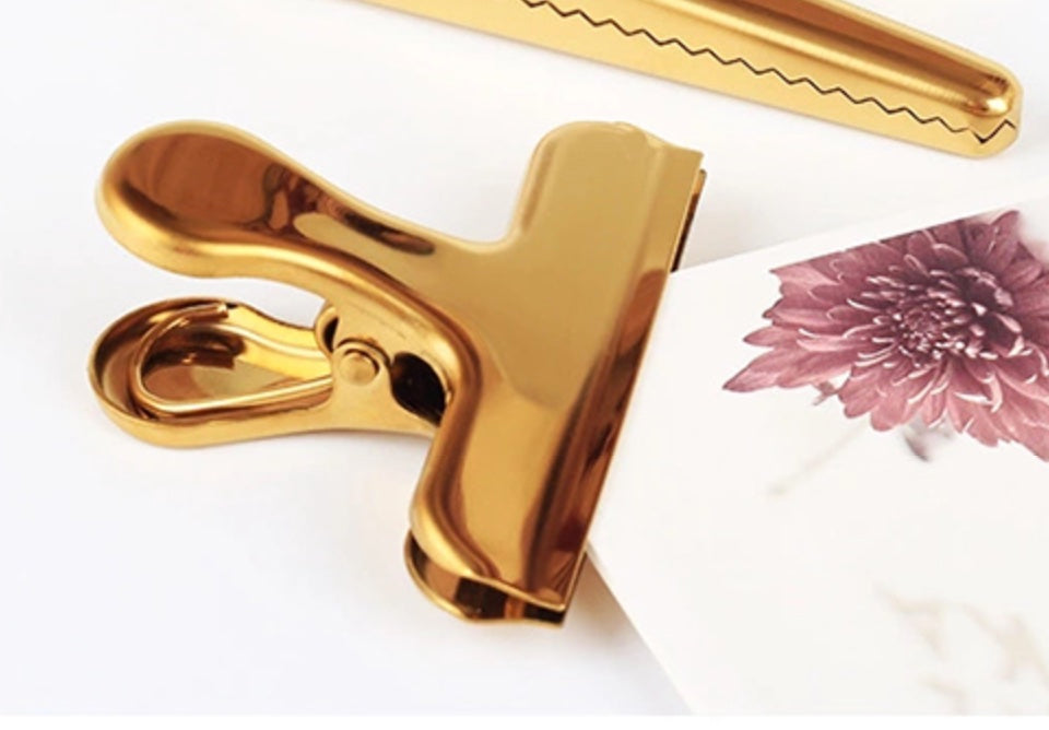 Metallic golden Drawing board/ Notebook Paper Clip. Combine style and practicality with this stylish paper clip that can stand on itself as a decorative item for your living room or office space. - ReStock info below -