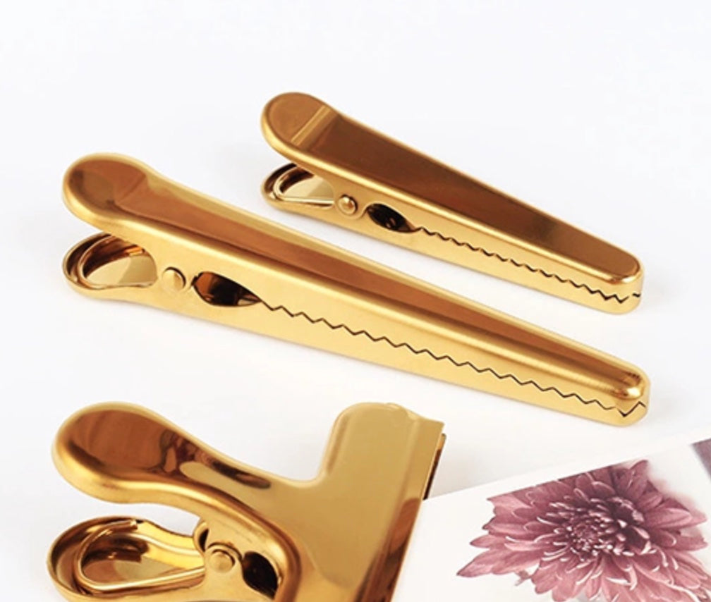 Metallic golden packaging sealing Clip. Combine style and practicality with this stylish sealing clip that can stand on itself as a decorative item for your kitchen or office space. Can be used to re-seal anything from bags of coffee grounds to pasta, crisps, baking flour, sugar... - ReStock info below -