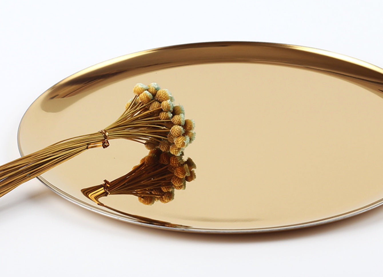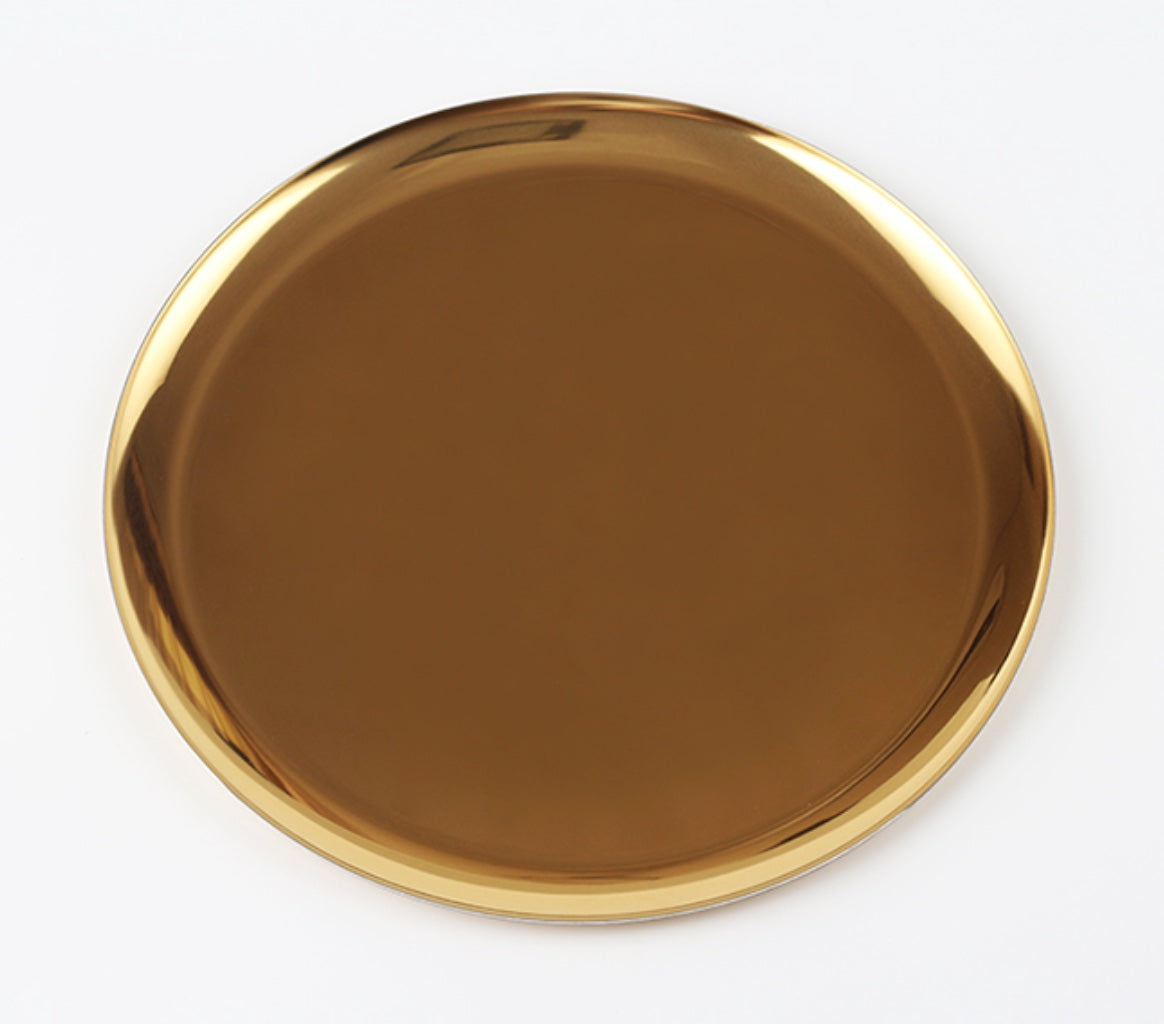 Metallic golden round tray for display and serving, gold colour with shiny finish