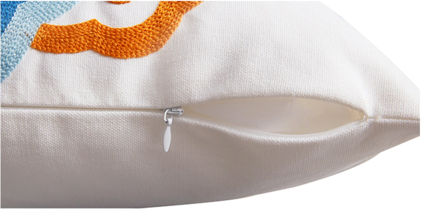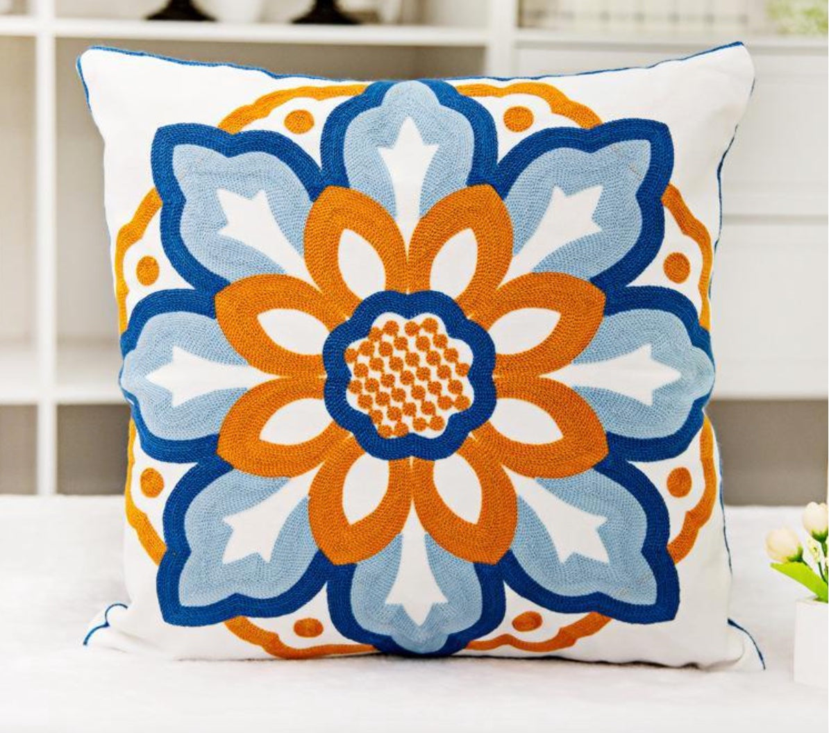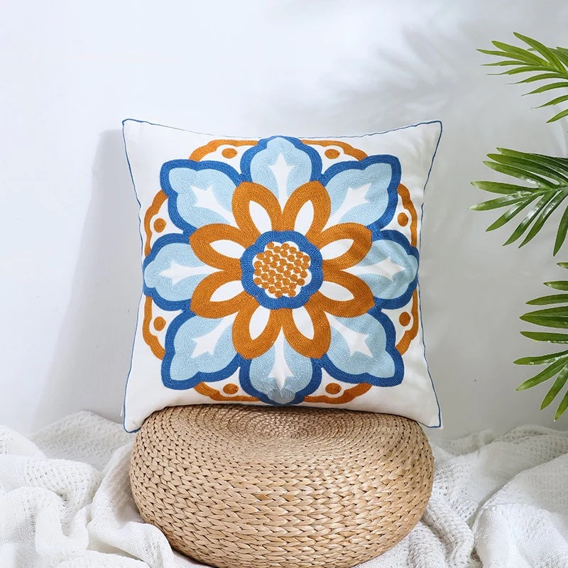 Multicoloured embroidered Cushion cover, orange flower. Brings a Boho pop of colour to your Sofa or chairs. Easily removable and washable (hand-wash advised). - ReStock info below -