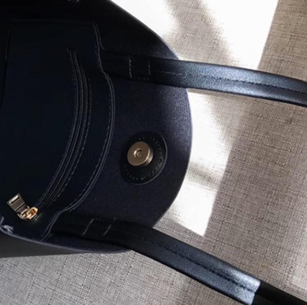 Vegan minimalistic A4 Tote bag, black leather style. Bring a sleek touch to your everyday style with this minimalistic A4 size tote bag. It's alternative material to leather makes it very durable and easily washable. It's A4 size allows to store a Medium size laptop as well as some small items while keeping everything tidy and light. The magnetic fastening toward its top allows to keep everything safe and easily accessible. In addition a small pocket hidden toward the top will keep your bus card or tissues always on hand. - ReStock info below -