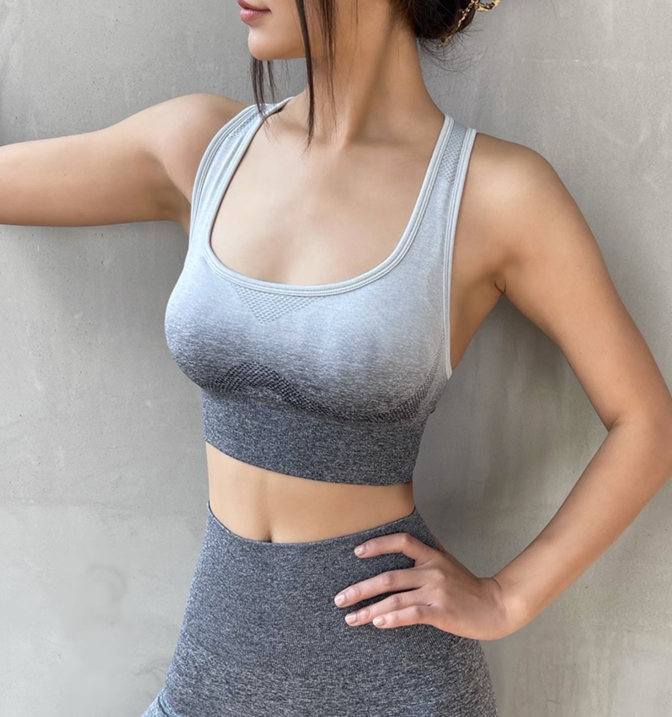 Yoga matching high waist pants and sports bra, grey ombre. Be sporty and sexy with this very comfortable/ stretchy pants and bra set that can be worn at the gym or styled for a day out. The pant's high waist elegantly embraces the body figures and doesn't compress the belly while exercising. Its slightly pleated shape at the back gently enhances the bottoms shape. The sports bra isn't too short and covers properly the top area for work outs. Its Y-shape highlights the shoulders and back while providing good support without over compressing.